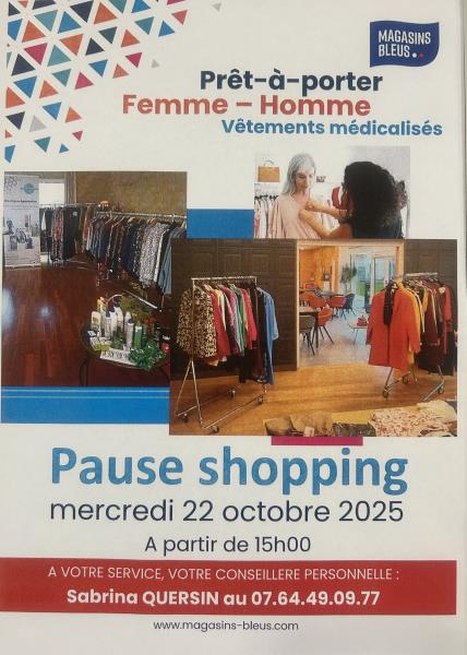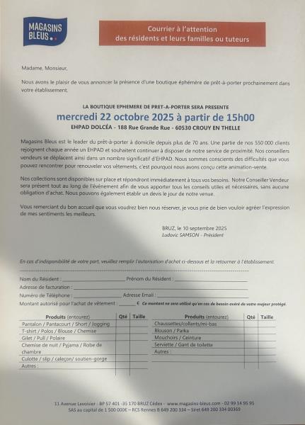 Nous aurons le plaisir de recevoir le mercredi 22 octobre, à partir de 15h, "magasins Bleu", avec notre conseillère Sabrina Quersin , spécialiste des vêtements médicalisés pour hommes et femmes.Je vous joins une autorisation d'achat, que vous pouvez nous retourner si vous ne pouvez pas vous déplacer.